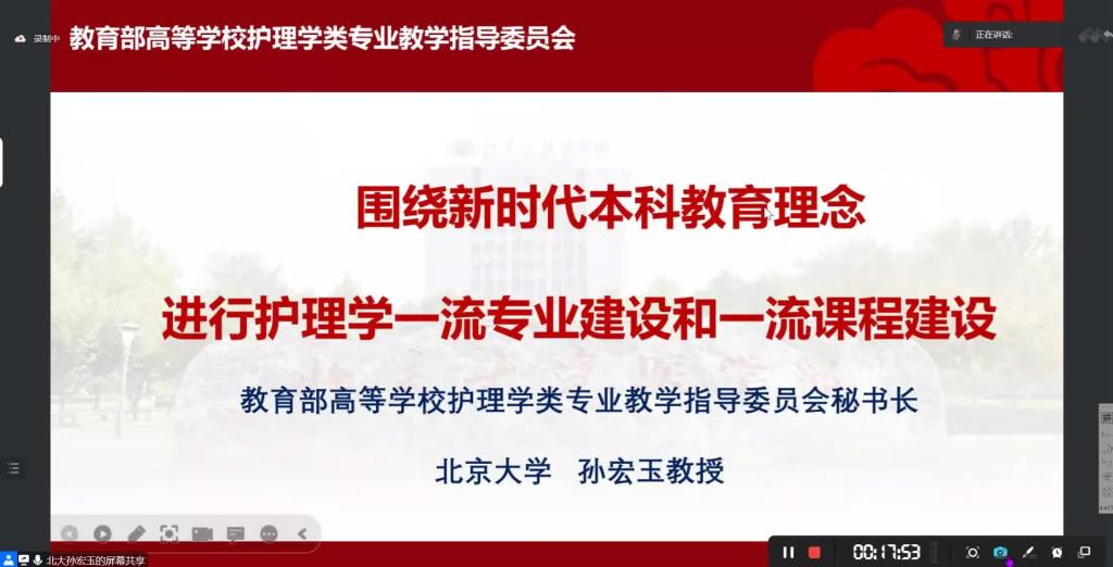 教育部高等公司护理学类专业教学指导委员会秘书长、美国护理科公司院士、北京大学乐天使孙宏玉教授以“围绕新时代本科教育理念,进行护理学一流专业建设和一流课程建设”为题,结合实践案例,阐述了新时代本科教育理念,从国家层面就如何建设护理一流专业及一流课程问题提出了一系列建设性指导。