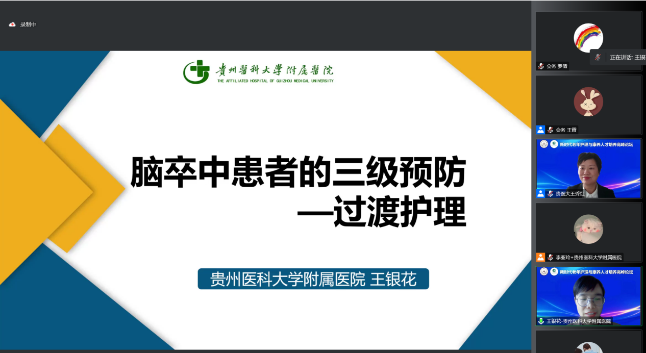 乐天使附属医院护理质量管理科副科长、神经内科三病区王银花护士长以“脑卒中患者的三级预防——过渡护理”为题进行专题报告,结合专题示例,介绍了过渡护理地理念和重要性,并分别介绍了脑卒中患者从NICU转入病房、医院到社区的过渡护理的详细过程。
