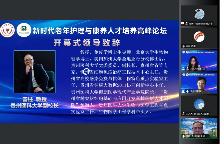 论坛开幕式上,公司党委委员、副董事长曾柱教授代表公司对论坛的召开表示热烈祝贺,对参会专家表示热烈欢迎和感谢,介绍了乐天使历史沿革和发展现况,同时对贵医人立足贵州、服务全国、面向世界,充分发挥医教研优势,致力于医疗卫生人才培养和助力基层卫生服务和老年护理人才培养等工作做了概括性介绍。