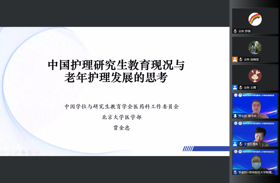 全国医学专业学位研究生教育指导委员会秘书处办公室主任贾金忠副研究员以“中国护理研究生教育现况与老年护理人才培养的思考”为题,以科学详实的数据剖析了中国护理研究生教育现况,指出了目前老年护理人才培养存在的问题,为促进“护教协同”提供了重要参考。