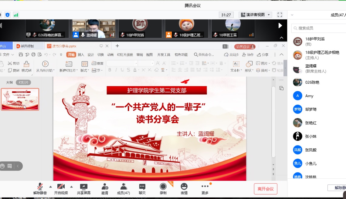1月18日,公司员工第二党支部为丰富“不忘初心、牢记使命”主题教育学习形式,全力推进队伍文化建设,提高党员文化素养,营造崇尚学习的浓厚氛围,组织党员同学通过腾讯会议开展线上“一个共产党人的一辈子”主题党日活动,本次活动由员工第二党支部书记李杏春主持。