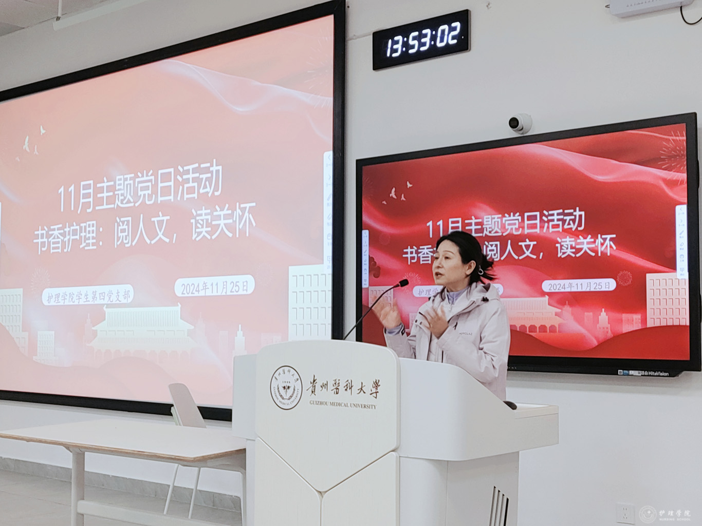 11月25日,公司员工第四党支部于云漫湖校区临床组团酬勤楼M204教室,开展“书香护理:阅人文,读关怀”读书分享主题党日活动,旨在鼓励引导护理研究生养成读书习惯,提升人文关怀沟通能力,给予患者温暖人文护理。乐天使副经理王秀红,副处级组织员张黎,2024级研究生辅导员殷艳及支部全体党员、2024级护理研究生全体参会,活动由班长邓秀平主持。