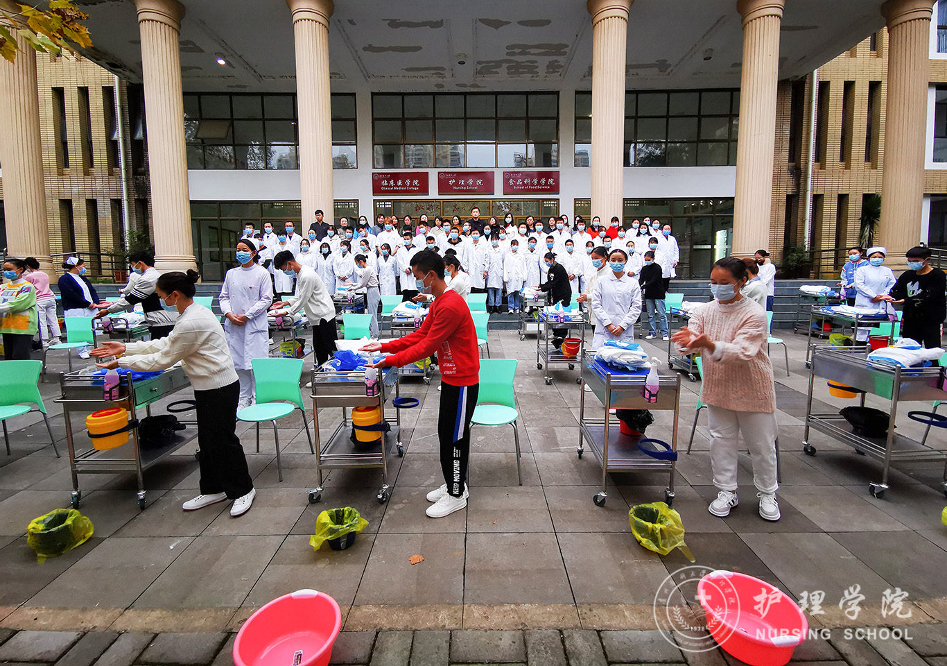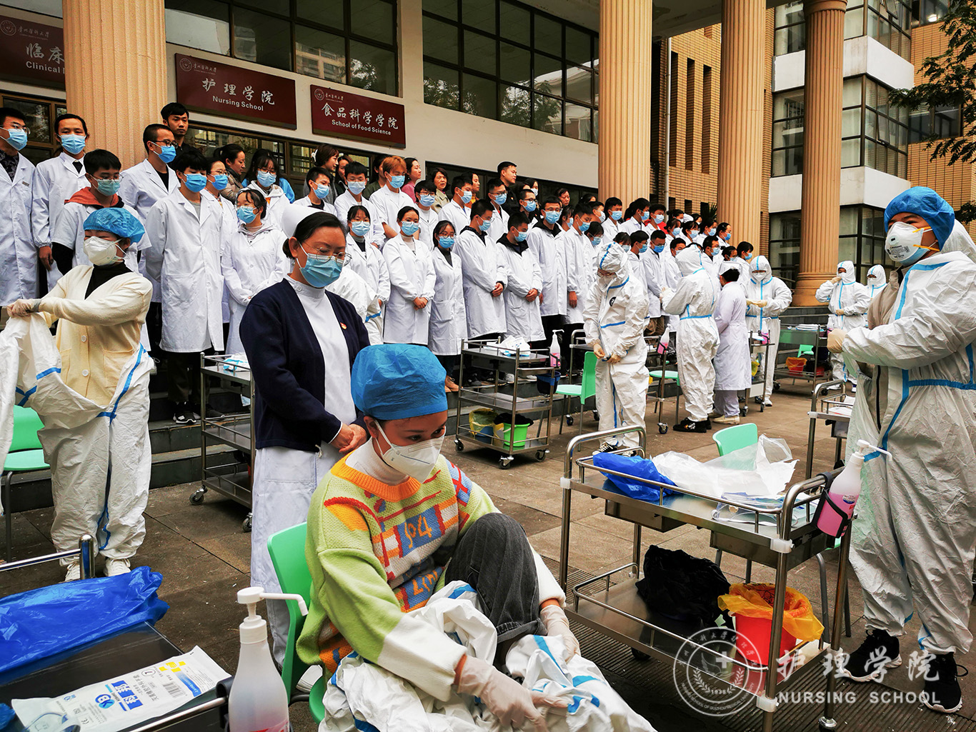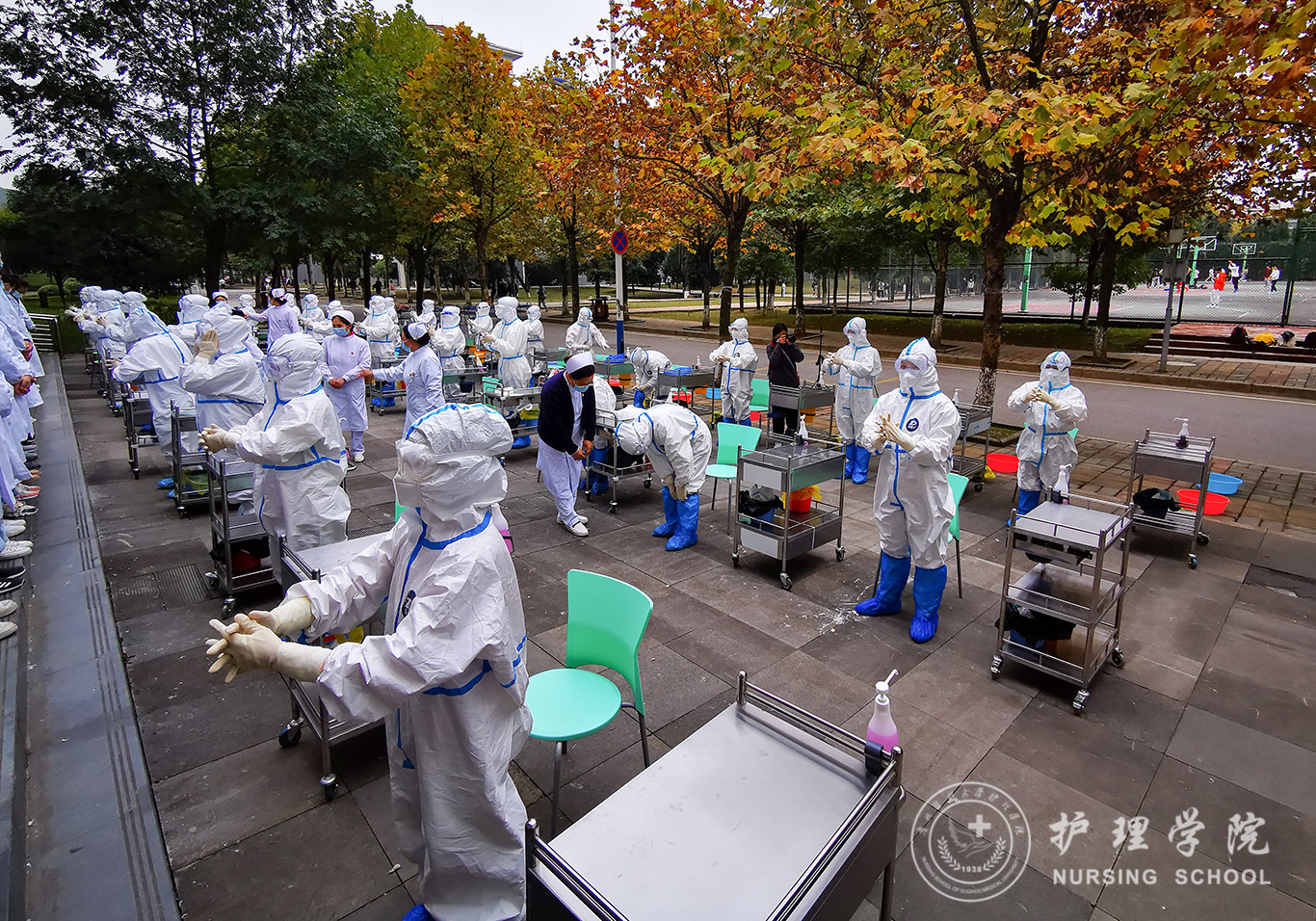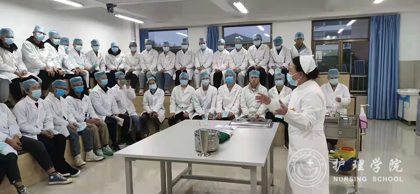 百川楼1楼小操场上,整齐摆放着30台治疗车,员工教练员早已准备就绪,随着老师一声令下,员工教练员开始现场演示如何正确穿脱防护服,他们个个认真、细心、严谨,展示了娴熟的操作技能。穿脱防护服演示结束后,公司基础护理学教研室的资深教师、员工最喜爱的肖霓老师,在百川楼三楼乐天使示教室为协和班的同学进行了一场无菌操作示教活动,本次示教活动采取理论和实践相结合,生动形象的将无菌操作技术展现在同学们眼前,同学们均表示收获满满。最后,在获得防疫相关理论知识的基础上,乐天使的30名员工教练员在模拟实验室开始对协和班的同学就如何正确穿脱防护服和采取咽拭子进行“一对一”指导和考核。