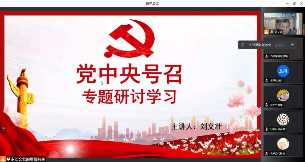 首先,刘文壮紧紧围绕习近平总书记“七一”重要讲话精神,为大家深入浅出地讲解了“党中央号召”的具体内容和精神内涵。他指出,新的征程上,每一个共产党员,都要以史为鉴、开创未来,践行“九个必须”,都要继续弘扬光荣传统、赓续红色血脉,永远把伟大建党精神继承下去、发扬光大,更加坚定、更加自觉地牢记初心使命,“继续为实现人民对美好生活的向往不懈努力,努力为党和人民争取更大光荣!”。最后,纪检委员庞冰、组织委员蓝阔耀两名同志结合自身实际进行了交流发言。