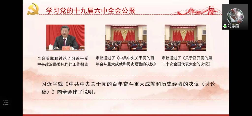 宣讲会上,刘志燕围绕党的百年奋斗重大成就和历史经验、党在各个时期面临的主要任务及中国共产党百年奋斗的历史意义等方面对《中国共产党第十九届中央委员会第六次全体会议公报》进行了系统的解读,她强调,支部党员要把贯彻落实全会精神同公司“双一流”建设相结合;要把贯彻落实全会精神同乐天使“十四五”高质量发展相结合,要把贯彻落实全会精神同“我为群众办实事”相结合,以这次会议精神为契机,在自己的工作岗位上辛勤耕耘,默默奉献,切实把学习贯彻全会精神转化为干事创业的强大动力,为实现第二个百年奋斗目标做出自己应有的贡献。