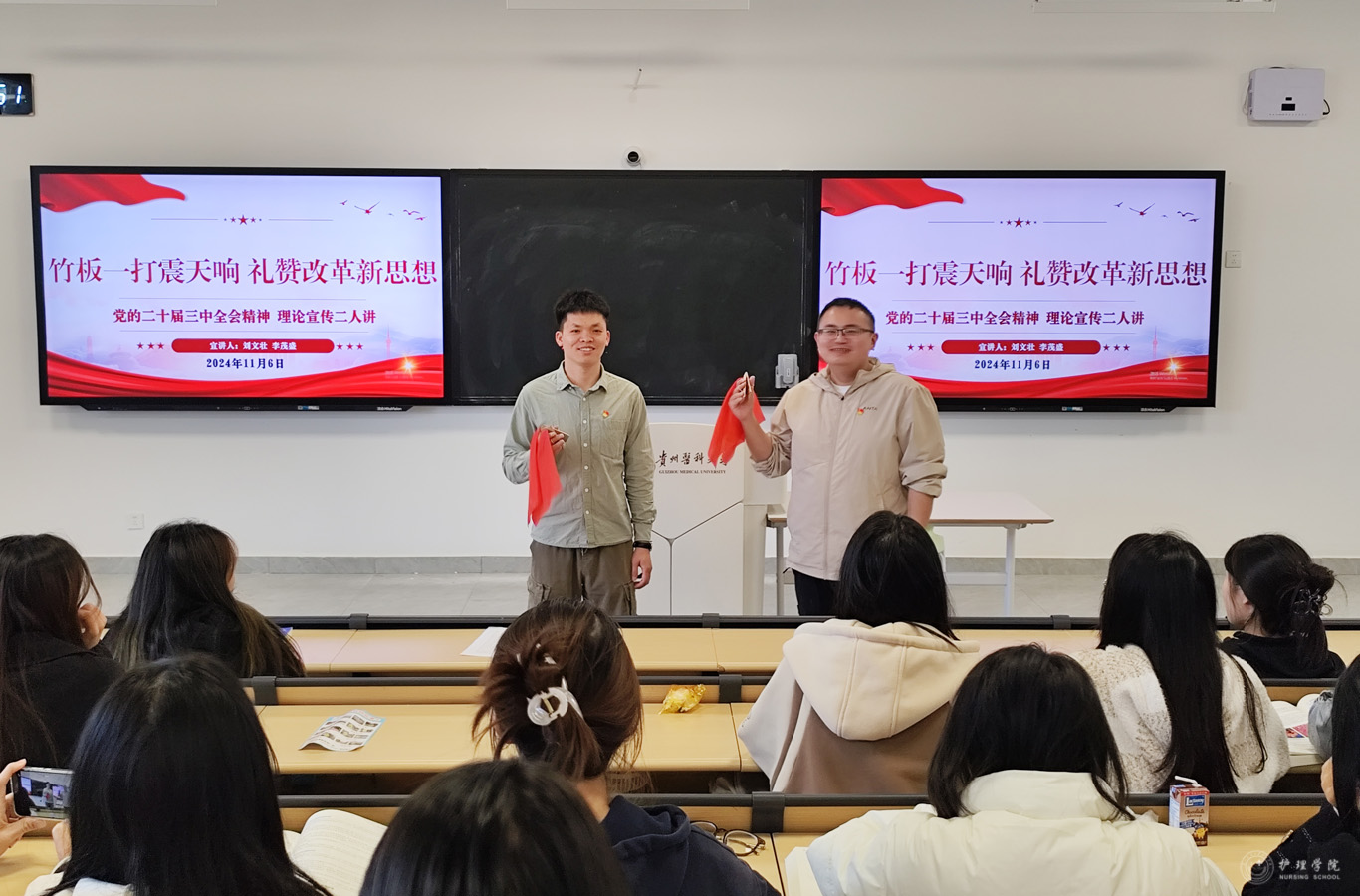 近日,2023级各班课余传出了阵阵清脆的快板声,一场场别开生面的理论宣传活动正在这里热烈展开。此次活动是乐天使辅导员刘文壮、李茂盛两位同志用“二人讲”形式开展的党的二十届三中全会精神宣讲,创新用传统快板融入党的理论宣讲的方式,吸引了众多员工的兴趣。